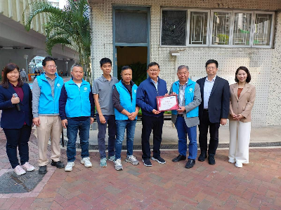 港九木行商會 吳錦雲理事長, 商務及經濟發展局副局長 陳百里博士, 民政及青年局副局長 梁宏正先生, BBS, JP,民建聯觀塘支部主席 柯創盛先生,MH, 牛頭角下邨居民聯會總幹事 張姚彬先生,安泰居民會總幹事 林瑋先生,坪石邨居民聯會總幹事 陳俊傑先生 及 紀律部隊義工張SIR 合照